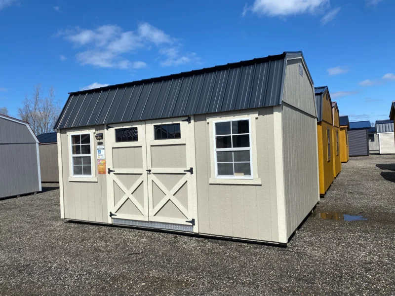If you’re looking for a 12×16 barn for sale near me, this barn is the perfect addition to your property. Painted in a stylish olive grey with a khaki gray accent, it features a bold black roof that enhances its overall appeal. This barn combines beauty with functionality, making it ideal for storing all your outdoor tools and equipment.